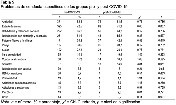 Incluimos una segunda tabla (Tabla 5) que muestra información diferente sobre el tipo de problemas: en la Tabla 4 se daban los porcentajes de los problemas principales de los consultantes, sólo uno por persona. Sin embargo, en la Tabla 5 se incluyen todos los problemas clínicamente relevantes en la persona y se utilizan categorías de problemas de comportamiento que no siguen estrictamente los criterios DSM. Respecto a los problemas de conducta específicos, los más frecuentes en el grupo pre-COVID fueron ansiedad (82,8%), bajo estado de ánimo (72,5%) y problemas de relación social (65,2%). Igualmente, éstos fueron los más frecuentes en el grupo post-COVID: ansiedad (81,6%), bajo estado de ánimo (71,3%) y problemas de relación social (63,2%). Como se puede ver en la Tabla 5, no se encontraron diferencias estadísticamente significativas en la frecuencia con que se presenta cada tipo de problema en los dos grupos.