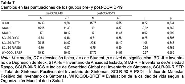 Los cambios en las puntuaciones de los cuestionarios que evalúan depresión, ansiedad, psicopatología y calidad de vida tras el alta de los grupos pre- y post-COVID-19 no mostraron diferencias estadísticamente significativas, como se muestran en la Tabla 7.