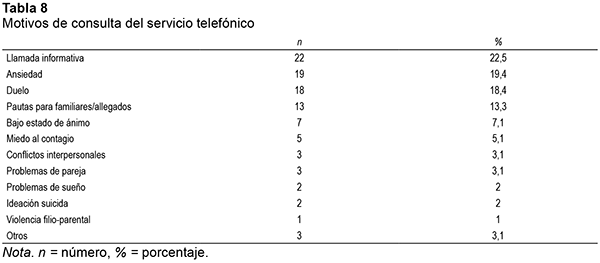 Respecto a los motivos de consulta, los más frecuentes fueron ansiedad (19,4%) y duelo (18,4%). En la Tabla 8 se muestra la frecuencia de cada motivo de consulta y se puede ver que se dio un elevado porcentaje de llamadas informativas para conocer las características del servicio telefónico (22,5%).