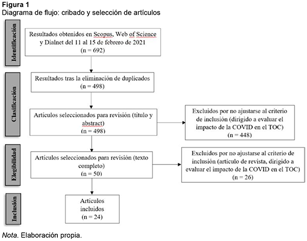 Los criterios de inclusión empleados han sido los siguientes: a) artículos de revista; b) presentaban análisis cuantitativo del impacto de la COVID-19 en la sintomatología obsesivo-compulsiva; c) sin limitaciones en la fecha de publicación; d) en idioma inglés o español, y e) pertenecientes al área de la psicología. Los criterios de exclusión han sido: a) publicaciones no accesibles a texto completo, y b) estudios que presentaban análisis cualitativo sobre el impacto de la COVID-19 en el TOC.