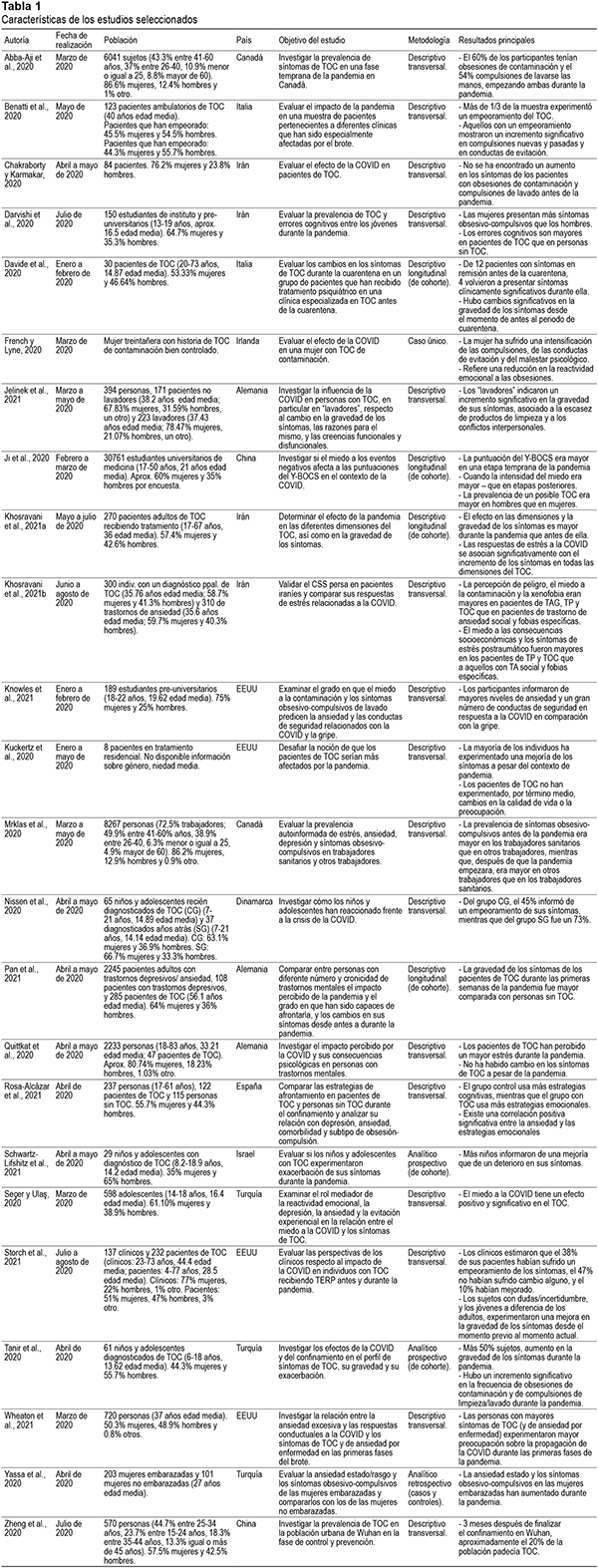 Este trabajo de revisión incluyó 7 estudios realizados en población general. Y un artículo comparó jóvenes de población general con jóvenes con diagnóstico de TOC (Darvishi et al., 2020). Se analizó la sintomatología obsesivo-compulsiva con inicio durante la pandemia en esta población en función de la fase de la pandemia en que se registra, del impacto en la gravedad de los síntomas y en grupos de población específicos como estudiantes de medicina, profesionales o embarazadas.