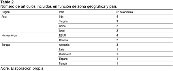 Los artículos seleccionados recogen datos de 11 países: 11 artículos centrados en Asia, pertenecientes a Irán, Turquía, China e Israel; 6 artículos centrados en Norteamérica, pertenecientes a EEUU y Canadá; y 7 artículos centrados en Europa, pertenecientes a Alemania, Italia, Dinamarca, España e Irlanda. En la Tabla 2 se especifica el número de artículos por país. No se registran tendencias diferenciadoras entre países ni continentes.
