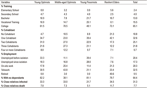 Lastly, Table 4 provides the sociodemographic characteristics of the different groups. The highest percentage of people who completed university education (73.1%) was in the Resilient Elders group. The Resilient Elders also had the highest percentage of people not cohabiting (21.3%) or with one cohabitant (42.1%). The percentages of people who lived with two cohabitants were similar in the Young Optimists (31%), Middle-aged Optimists (27%) and Young Pessimists (22.9%) groups. Finally, the Middle-aged Optimists had the highest percentage of people with three cohabitants (27.3%) and four or more cohabitants (12.2%). Looking at employment, it is worth noting that the highest percentage of unemployed people both during (28%) and before the lockdown (39.4%) was in the Young Pessimists, while the highest percentage of employed people who kept their jobs either in-person (25.4%) or remotely (43.8%) was in the Middle-aged Optimists. Finally, the Middle-aged Optimists group had the highest proportion of people who had to care for dependents (38.1% with no dependents). The Young Pessimistic Group had the lowest percentage of relatives who had been infected with (21.7%) or died from (5.1%) COVID-19.