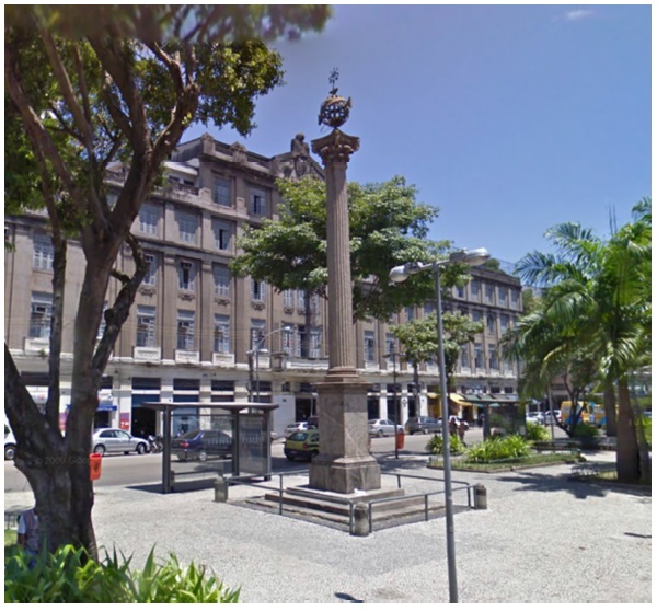 Na verdade, o chafariz monumental projetado por Grandjean de Montigny nunca chegou a ser executado, embora a Praça Municipal tenha sido regularizada para recebê-lo60. Um outro monumento alternativo, de características distintas, menos grandioso e de menor qualidade artística acabou sendo erguido anos depois, na década de 1870, por um de seus discípulos, o arquiteto das Obras Públicas Francisco Joaquim Bethencourt da Silva: uma coluna circular de granito com caneluras, formada por 91 monolitos sobre pedestal circular também de granito, elevada sobre três degraus. Nessa coluna foram colocadas quatro bicas, que jorravam água em um tanque retangular; encimada por um capitel coríntio, sobre ele foi colocada uma esfera armilar com as três setas que simbolizam o martírio de São Sebastião, padroeiro do Rio de Janeiro, e que compõem as armas da cidade. Esse marco comemorativo da chegada da imperatriz foi inaugurado em 02 de dezembro de 187261 e encontra-se até hoje no local, a atual Praça Jornal do Commercio, embora tenham sido retiradas as bicas e o tanque que o compunham originalmente (Figura 10). Na sua base, uma placa ali afixada pela Secretaria Municipal de Cultura informa atualmente o seguinte: "neste local existiu o Cais da Imperatriz. Em 1843, o antigo Cais do Valongo foi alargado e embelezado para receber a futura Imperatriz Teresa Cristina, que chegava para casar com D. Pedro II".