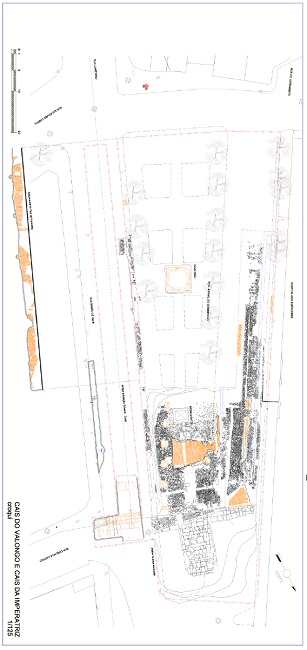 Do lado oposto, junto ao HSE, tampouco foi possível detectar seus limites, já que ele se estendia em direção ao pátio do hospital, hoje ocupado por um estacionamento, o que inviabilizou intervenções no local. Mesmo assim, a canaleta principal de escoamento de águas pluviais pode ser tentativamente utilizada como um possível elemento para se cogitar a área ocupada pelo cais deste outro lado, se atribuirmos a ela, originalmente, uma centralidade neste espaço. Hoje, sua condição é de total assimetria na área exposta pelas escavações, o que decerto não corresponde ao que era à época, de tal forma que uma projeção, de caráter meramente especulativo, pode ser feita no sentido de se tentar estabelecer a área original do Cais do Valongo junto ao HSE.