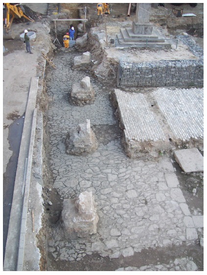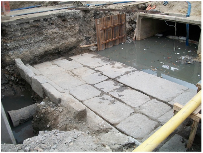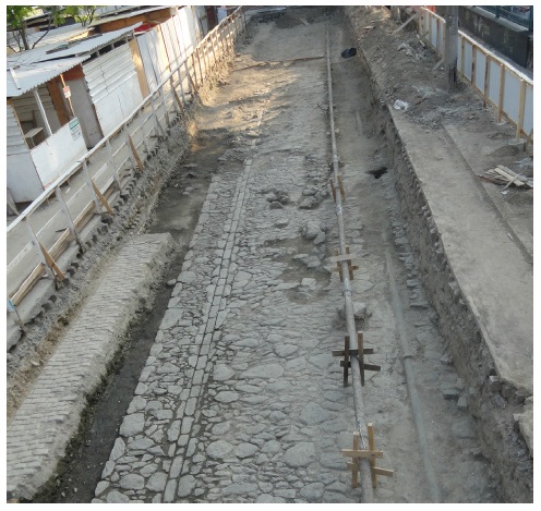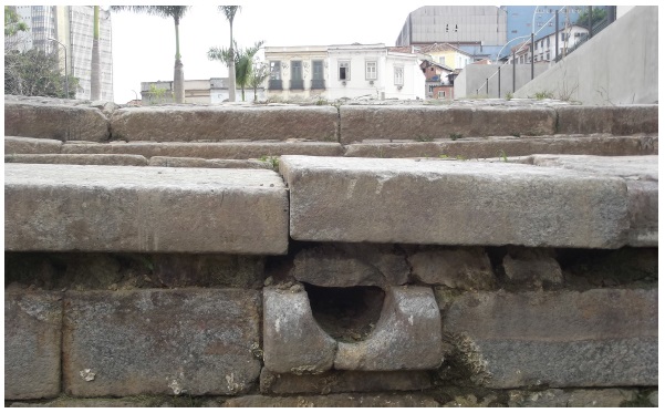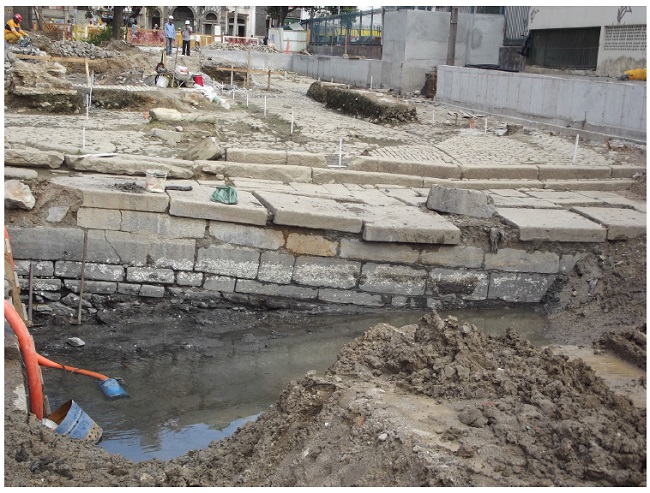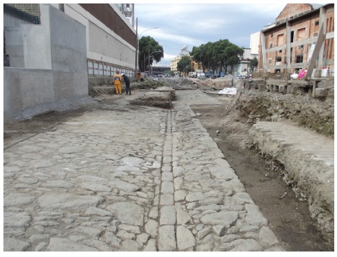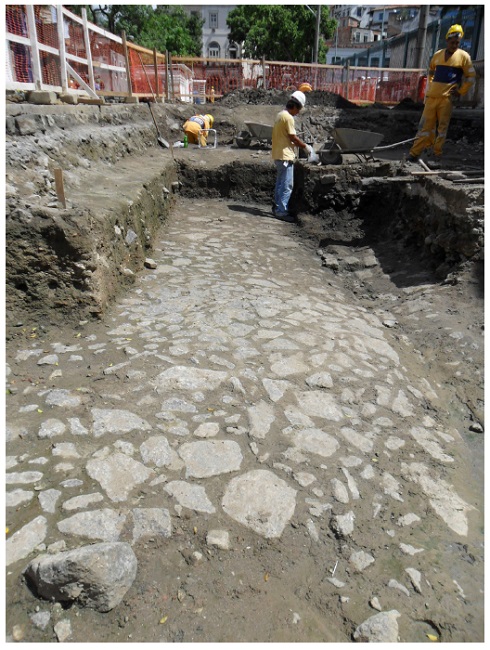 As escavações arqueológicas que trouxeram à tona remanescentes do cais construído na região do Valongo, em 1811, pelo Intendente Paulo Fernandes Viana, expuseram um calçamento que, embora composto por pedras irregulares e grosseiramente talhadas, foi feito com esmero, bem arrematado nas suas bordas e com um primoroso sistema de drenagem (Figuras 99 a 101).