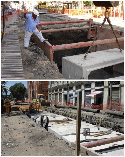 Essa trincheira, escavada mecanicamente, foi subdidivida em trechos, considerando-se Trecho 1 aquele onde foram encontradas as lajotas de pedra do suposto Cais da Imperatriz. Com largura aproximada de 5,50 m, essa trincheira, que atingiu em média 3,0 m de profundidade, foi subdividida pela equipe de arqueologia em trechos também de cerca de 5,50 m de extensão, gerando unidades de escavação de aproximadamente 5,50 x 5,50 m, dispostas em sucessão, do Trecho 1 ao 15, ao longo de 87,0 m. Essa medida não foi determinada de forma arbitrária, mas estabelecida a partir das dimensões da blindagem metálica implantada previamente para viabilizar a colocação das aduelas de concreto de seção retangular, que compuseram a galeria de águas pluviais (Figuras 15 e 16).