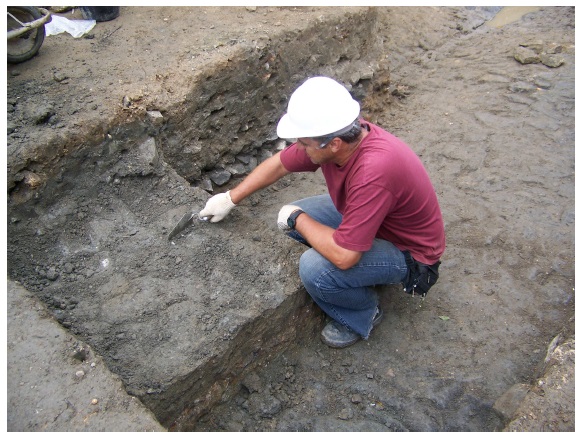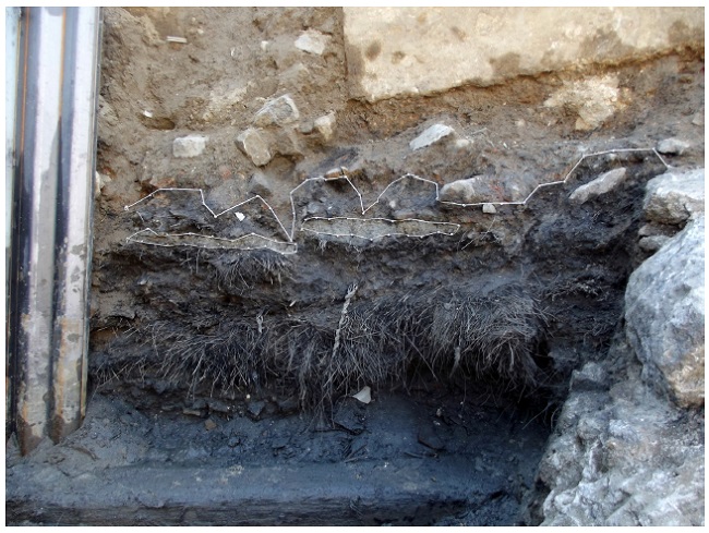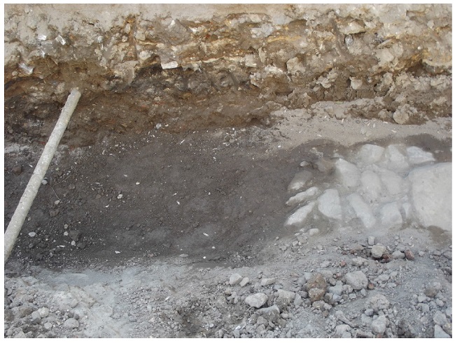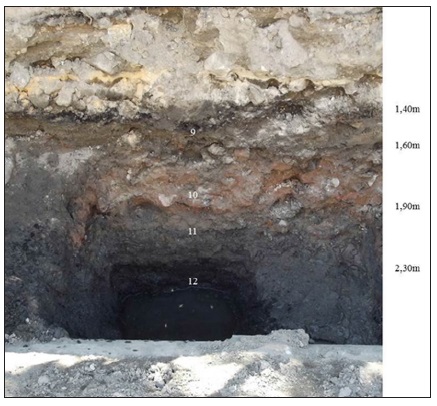 Essa escavação expôs, na parede lateral, um perfil estratigráfico que apresenta, na sua base, a camada arqueológica de sedimento arenoso enegrecido, com muita matéria orgânica decomposta e grande quantidade de vestígios arqueológicos, sucedida por camadas de aterro (Figuras 79 a 82).