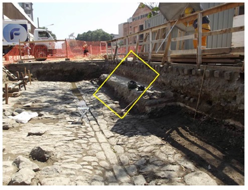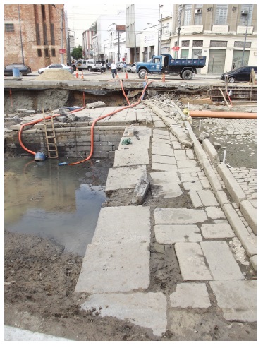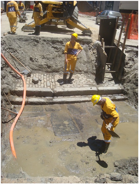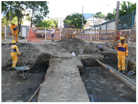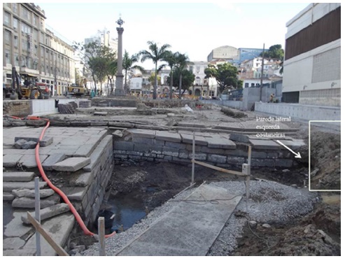 Cumpre destacar que o local escolhido para a implantação dessa nova galeria foi precisamente o do antigo canal natural de drenagem que serpenteava pelo talvegue entre os morros da Conceição e do Livramento, coletando as águas do interior e das vertentes das duas elevações e despejando-as no mar. Ou seja, o caminho natural das águas, que corresponde atualmente às ruas Camerino (antiga rua do Valongo, onde estava situado o mercado de escravos, posteriormente rua da Imperatriz), e seu prolongamento hoje em dia, a avenida Barão de Tefé. Obra de caráter emergencial, a galeria de águas pluviais vinha sendo implantada em trecho liberado de monitoramento pelo Iphan, no sentido do porto para dentro, até chegar ao ponto em que o mar alcançava, no século XIX, a atual Praça Jornal do Commercio, na confluência com a rua Coelho e Castro. Quando a equipe de arqueologia foi autorizada a iniciar o trabalho nesse local, em janeiro de 2011, já havia sido removida a cobertura asfáltica de uma área de 11,50 x 5,10 m, escavada mecanicamente até 1,40m.