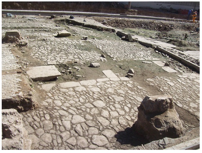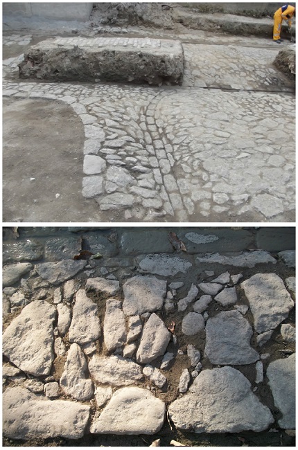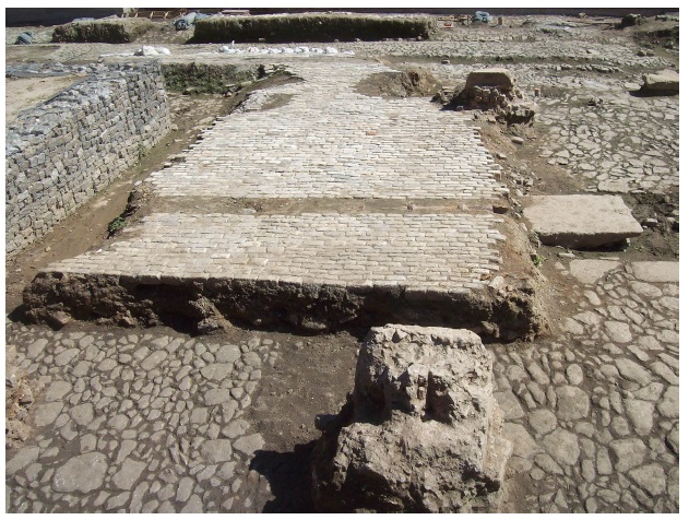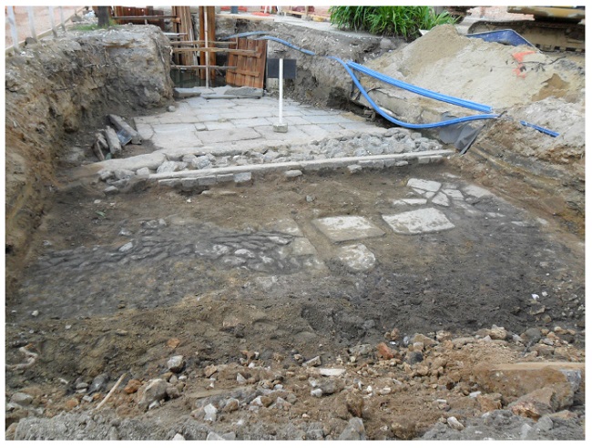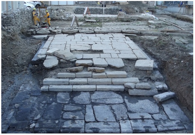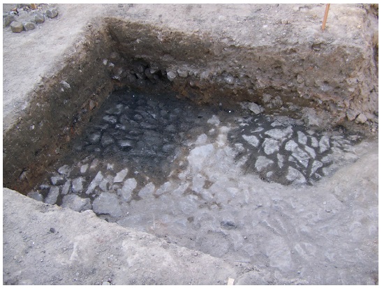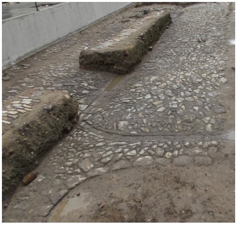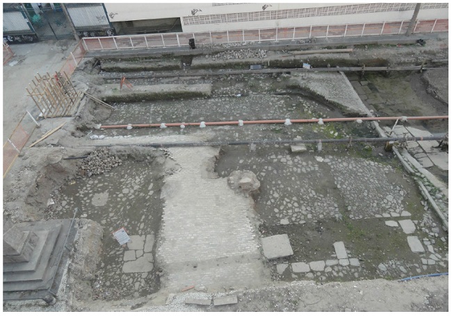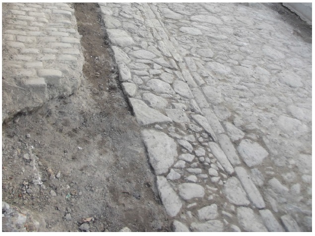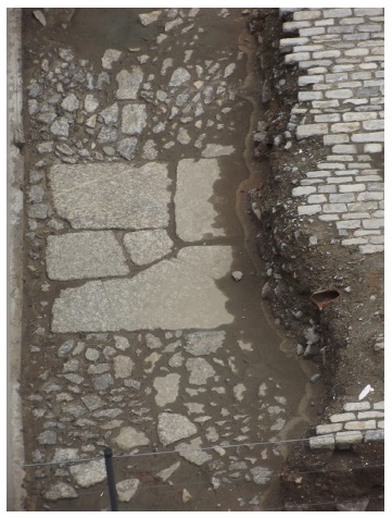 A montante das lajotas surgiram dois degraus formados por blocos de pedra posicionados verticalmente, e paralelepípedos. Adjacentes a eles, os paralelos foram assentados com uma configuração geométrica, parte no sentido noroeste/sudeste, parte no sentido sudoeste/nordeste. Da mesma forma, esse calçamento foi atribuído ao Cais da Imperatriz, não só por se configurar como uma continuidade em relação às lajotas de pedra do cais, mas porque esse tipo de calçamento surgiu mais tardiamente na área urbana do Rio de Janeiro, não sendo possível atribuí-lo ao período de funcionamento do Valongo (Figura 20).