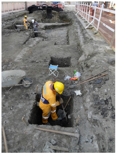 A partir desse ponto, foram feitas dezenas de sondagens para exame da estratigrafia e detecção da possível ocorrência dos calçamentos do Cais do Valongo e do Cais da Imperatriz no subsolo. Para fins de maior controle, essa frente foi subdividida nas áreas Sul, Norte e Oeste, tendo as siglas das sondagens aí realizadas incorporado essa orientação. Na área Sul, foram demarcadas 26; na Norte, 20; e na Oeste, 48. As sondagens, uma vez tendo proporcionado uma boa compreensão do comportamento estratigráfico e deposicional, não justificavam mais a abertura de novos cortes, razão pela qual eles foram posteriormente unificados em trincheiras e/ou transformados em escavações em área ampla, para um melhor entendimento da organização do espaço (Figuras 21 a 24). Algumas não foram escavadas em sua totalidade, por conterem remanescentes do Cais da Imperatriz, tendo a escavação se aprofundado apenas até o esse nível, preservando-se seu calçamento. O do Cais do Valongo não foi observado apenas em alguns poucos cortes; onde ele foi encontrado, suas profundidades variaram de acordo com o aclive em direção à rua Sacadura Cabral, desde 1.80m a 1,0 m67.