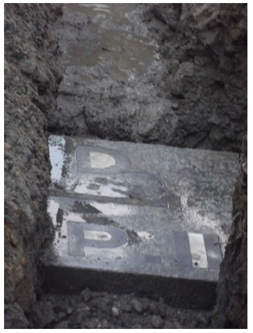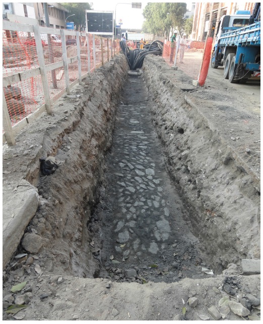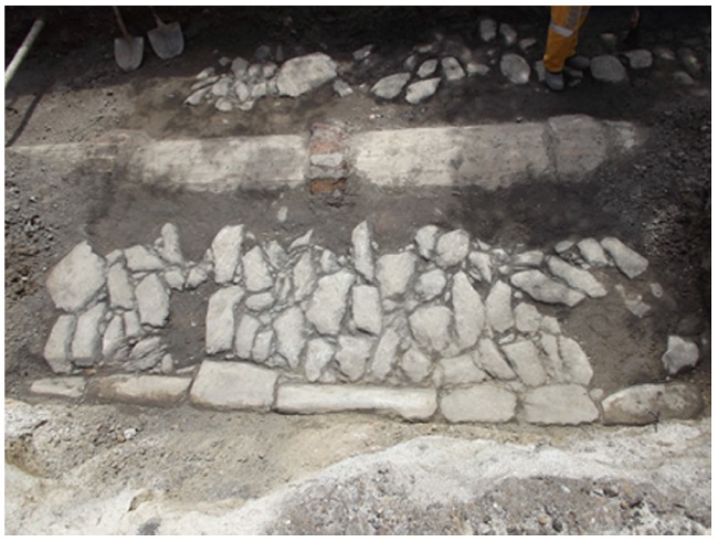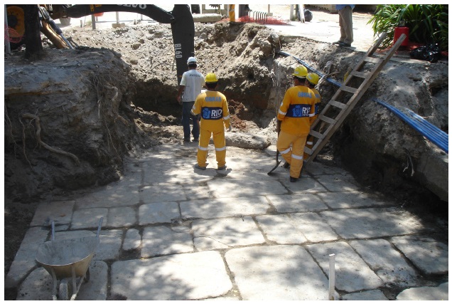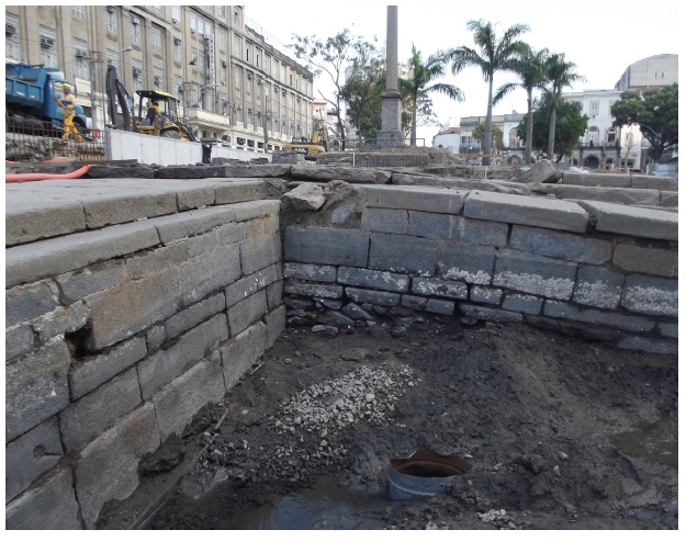 Com a escavação dessa estrutura para além de um envelopamento de energia elétrica e de um duto de fibra ótica que atravessavam a área, ela foi exposta em sua totalidade, permitindo constatar que foi grosseiramente sobreposta às lajotas de pedra do cais da Imperatriz (Figura 28).