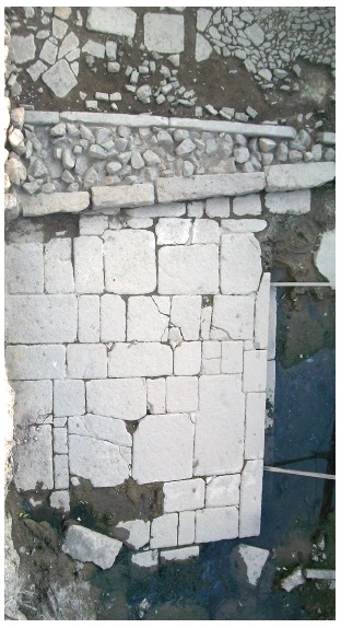 A plataforma de lajotas do cais à direita da rampa de desembarque mediu em sua totalidade 14,0 m de extensão por 3,10 m de largura. Em superfície, ela apresenta blocos maiores e mais regulares na extremidade distal, e menores e menos regulares na proximal (com medidas muito variadas). Trata-se igualmente de uma edificação ciclópica, cujo sistema construtivo foi o mesmo da rampa, em alvenaria de pedras arrumadas, de dimensões variadas, porém em sua maioria grandes. Os dois degraus de acesso à praça, feitos de longos paralelepípedos retângulos (meios-fios medindo entre 1,25 e até 2,80 m de extensão x 0,20 m de largura) entremeados com outros de dimensões menores (0,30 e 0,85 m x 0,20 m), mediram 0,30 m de piso e 0,20 m de espelho para ambos (Figuras 88 a 90).