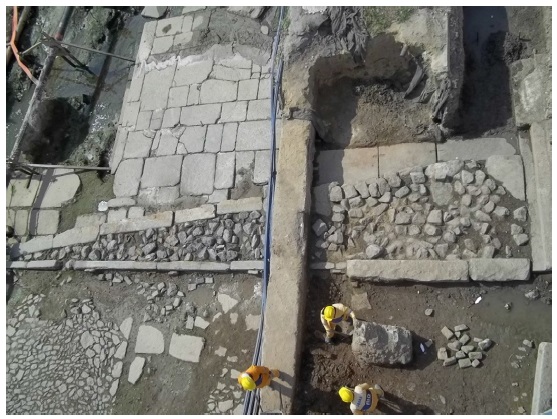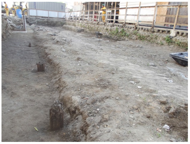 Paralela e simultaneamente ao início da escavação da trincheira correspondente à Frente 1, na altura da rua Coelho e Castro, foi cortado o asfalto para abertura de uma outra trincheira na pista oposta da avenida Barão de Tefé, à direita, medindo 6,0 x 1,0 m. A ampliação da escavação nesse ponto permitiu uma melhor compreensão da estratigrafia, que expôs uma cobertura asfáltica com aproximadamente 0,15 m, seguida de uma camada de aterro bastante espessa, que chegou a uma profundidade de 1,60 m. Aí foi encontrado outro segmento das lajotas de pedra, semelhante ao encontrado no Trecho 1, atribuído tentativamente ao Cais da Imperatriz (Figura 19).