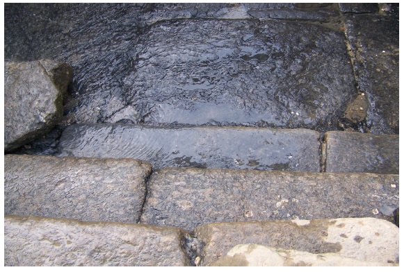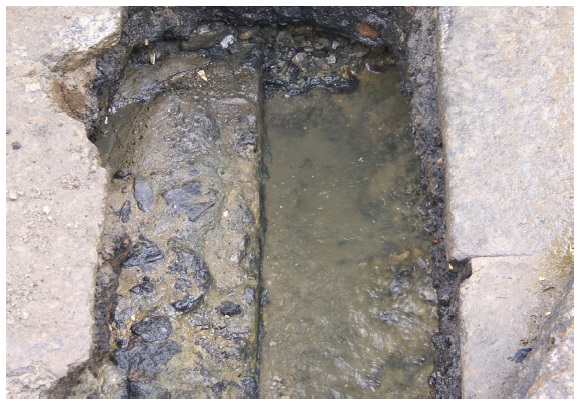 A necessidade de canalizar as águas pluviais, que desciam de enxurrada pela Ladeira do Livramento por ocasião de chuvas fortes, fez com que fosse construída a canaleta de escoamento que atravessa todo o Valongo, desde as imediações da ladeira até o cais, tal como informado anteriormente na apresentação das Frentes 2 e 4. Contudo, nada pode ser dito a esse respeito com referência ao Cais da Imperatriz, em virtude do seu calçamento ter sido em grande parte destruído. De todo modo, uma bica para desaguá-las no mar, em pedra lavrada, composta de duas metades unidas, foi encontrada nessa parede ciclópica, a 3,30 m da parede do Hospital dos Servidores do Estado e a 0,50 m abaixo da superfície das lajotas (Figuras 91 e 92).