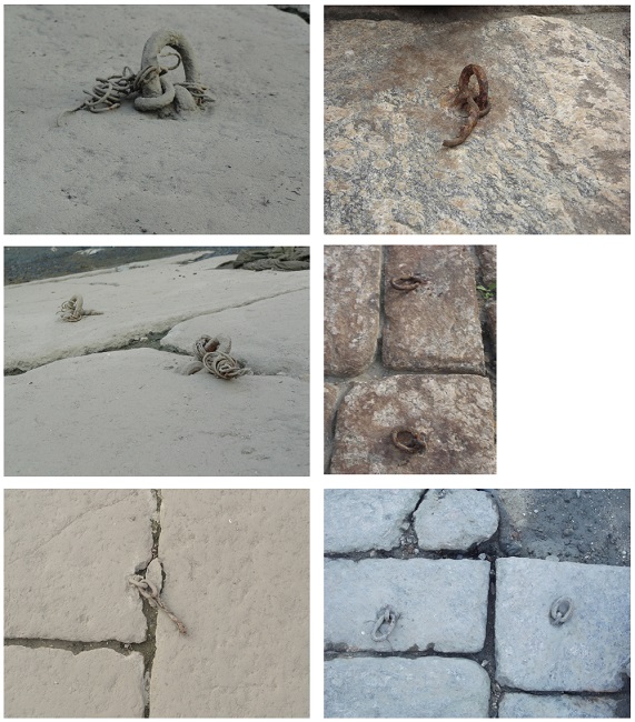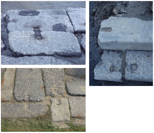 O reaproveitamentos de pedras de outros locais foi uma prática frequente, como consta em resolução da Câmara, datada de outubro de 1842, que autorizou a remoção de pedras dos degraus do antigo pelourinho da cidade, localizado no Campo de Santana, bem como as pilastras de pedra da ponte de São Cristóvão para serem aproveitadas na obra do cais71. Algumas lajotas apresentam marcas que atestam essas reutilizações (Figura 87).