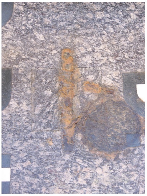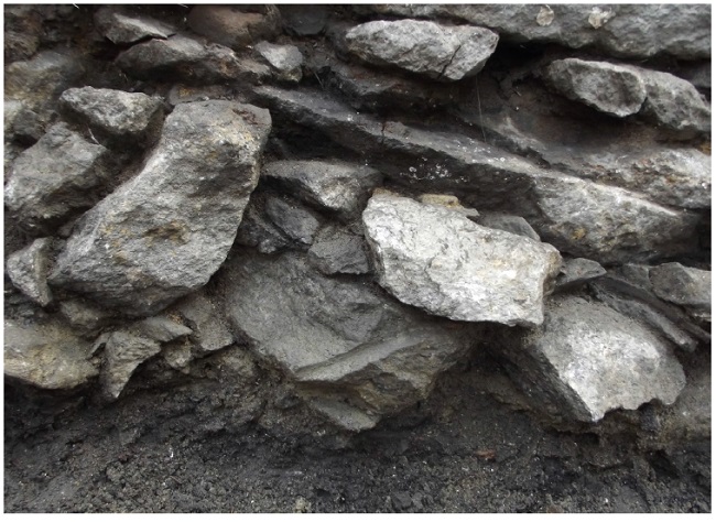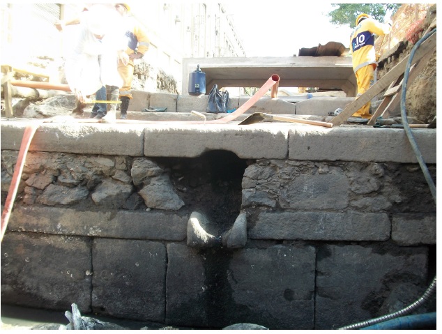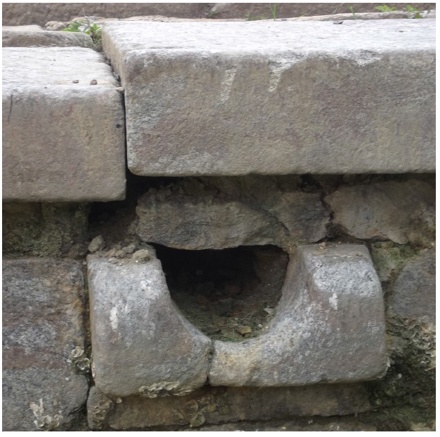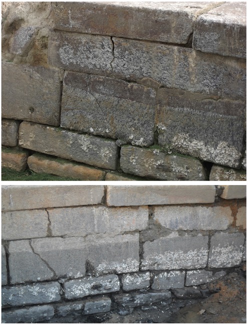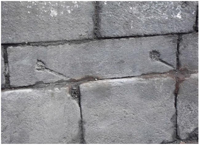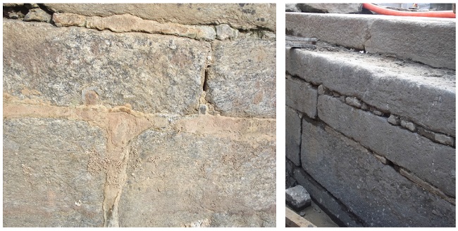 Tentativas de reforçar a estrutura com novas argamassas foram feitas em momentos posteriores à sua construção, quando algumas de suas juntas foram grosseiramente emplastradas com diferentes tipos de argamassas ou preenchidas com pedras (Figuras 85 e 86).