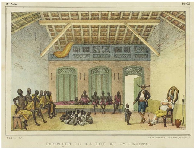 Esses documentos expõem de forma clara os componentes do complexo formado na região do Valongo para o comércio de carne humana: o cais, local de desembarque dos africanos recém-chegados; o mercado, na rua do Valongo, onde eram negociados os que se encontravam em condições de serem vendidos14 (Figuras 5 e 6); o lazareto, na Gamboa, onde deveriam ser isolados em quarentena os que se encontravam infectados e os já moribundos; e o cemitério dos Pretos Novos, à rua Pedro Ernesto, onde deveriam ser enterrados os que faleciam15. Vê-se, por meio desse documento, que as condições reclamadas décadas antes pelo Marquês do Lavradio para o comércio de escravos no centro da cidade foram mantidas, ou mesmo pioradas, com a transferência do complexo para a região do Valongo.