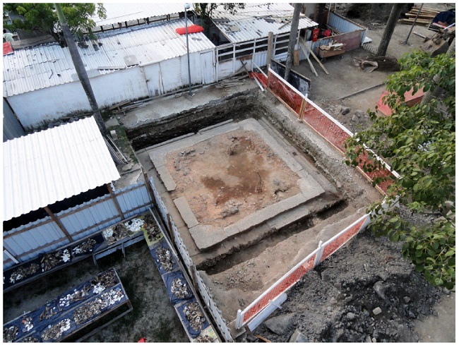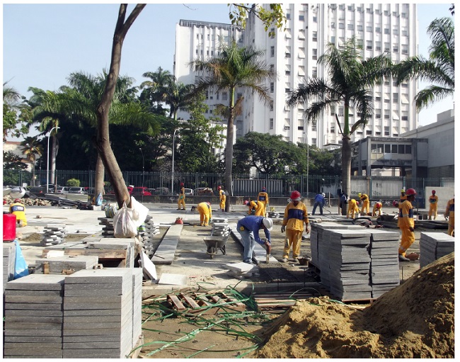 Em decorrência da nova configuração que a Praça Jornal do Commercio assumiu em virtude do achado do Cais do Valongo, ela foi reurbanizada à luz de um projeto desenvolvido em 2011 pela então Subsecretaria de Patrimônio Cultural, Intervenção Urbana, Arquitetura e Design, transformada, em 2012, no Instituto Rio Patrimônio da Humanidade. Atendendo a essa nova concepção, foi rebaixado o nível da antiga praça em 0,60 m e nivelado para assentamento de um novo piso em placas de granito, tendo sido reimplantadas as palmeiras e árvores nela previamente existentes, retiradas em caráter provisório para a execução da obra (Figuras 108 a 110). Muros de arrimo foram construídos nos limites com as Frentes 3 e 5, somando-se aos das Frentes 2 e 4, e assim completando seu entorno. Todas essas atividades implicaram intervenções no subsolo, que receberam o devido acompanhamento arqueológico. Contudo, não foram encontrados nem estruturas nem vestígios arqueológicos na profundidade alcançada, salvo alguns poucos fragmentos descontextualizados, sugerindo tratar-se de material misturado a aterro. Cabe destacar que, em profundidade em torno de 1,20 a 1,30 m, encontra-se o piso de terra batida, bastante compactado, identificado nas sondagens realizadas na praça.