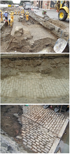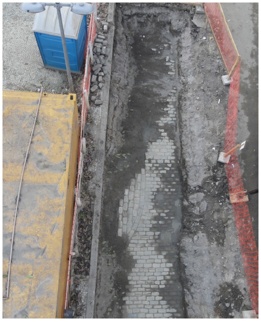 Sobreviveram apenas algumas ilhas esparsas do calçamento em paralelos, severamente danificado ao longo do século XX pela passagem, em diferentes momentos, de redes subterrâneas de água, esgoto, gás, luz, drenagem de águas pluviais, telefonia e fibra ótica. Mais profundo, o calçamento do Cais do Valongo foi menos afetado, o que possibilitou sua preservação em melhores condições, embora tenha sido também atingido em certos pontos. Alguns trechos recuperados desse calçamento de paralelos permitem supor que ele foi feito em padrões geométricos, ora retilíneos, ora curvilíneos, mas sua descontinuidade não permitiu uma recomposição mínima de sua feição original (Figuras 103 a 105).