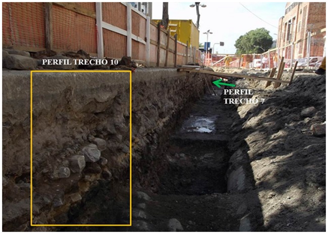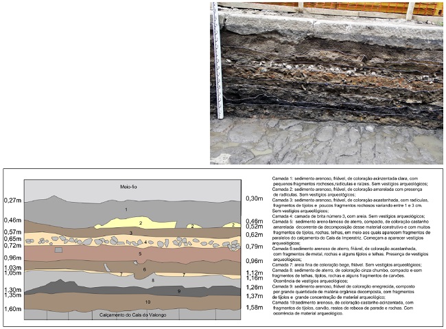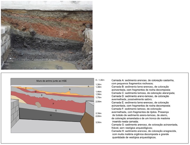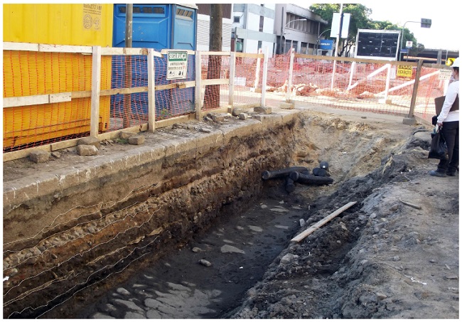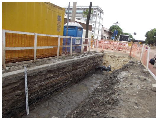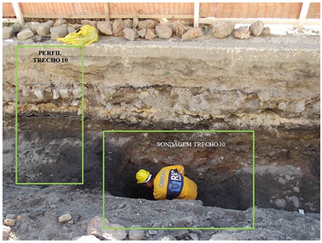 Ao final do Trecho 1, foi encontrada a outra extremidade do tubo de ferro, de 0,40 m de diâmetro. Entre os Trechos 2 e 4, foi observada a seguinte estratigrafia: logo abaixo do asfalto, camada 1, composta por sedimento areno-lamoso, com coloração marrom clara e manchas alaranjadas, fragmentos de rochas, tijolos e telhas, sem vestígios arqueológicos, desde a superfície até 2,00 m de profundidade, típica de aterro. Camada 2: em nível mais profundo, entre 2,0 e 3,0 m, apareceu uma camada de sedimento areno-lamoso, heterogêneo, de coloração marrom muito escuro, com presença de fibras vegetais de Attalea funifera (piaçava), e forte concentração de vestígios arqueológicos. Os materiais arqueológicos que não foram identificados visualmente durante a escavação, ou mesmo por vistoria posterior à coleta dos sedimentos, foi encaminhado para peneiramento, em razão da altíssima fertilidade arqueológica dessa camada.