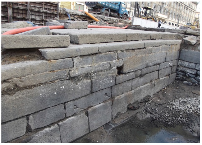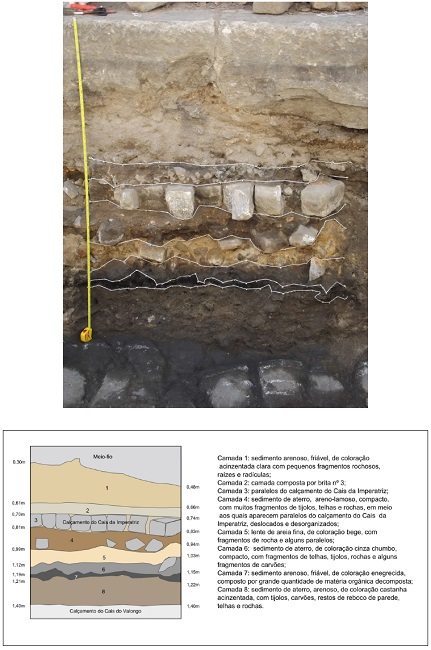 Após a complicada e morosa remoção completa dessas redes, para a qual foi necessário esperar precisamente um ano, foram retomadas as escavações mecânica e manual da área fronteira ao cais. Livres das diferentes tubulações, foi possível escavar o Trecho 0 da Frente 2, os trechos de 0 a 3 do limite entre as Frentes 2 e 3, assim como ampliar e aprofundar a escavação da rampa de lajotas de pedra da Frente 3. Essa escavação expôs a fachada da estrutura edificada do cais na Frentes 2 e no seu limite com a 3 (Figuras 77 a 78), permitindo não apenas o exame do seu sistema construtivo, mas também das avarias por ela sofridas ao longo do século XIX.