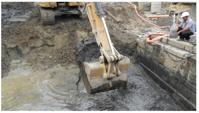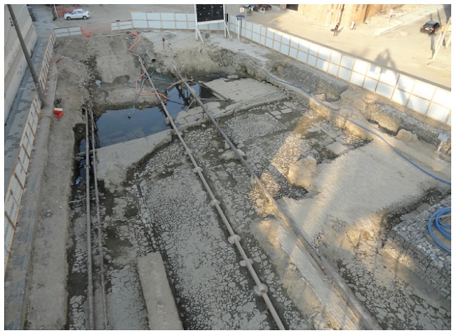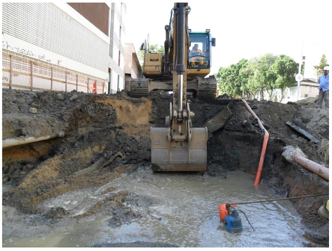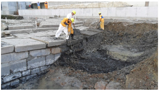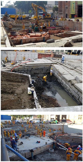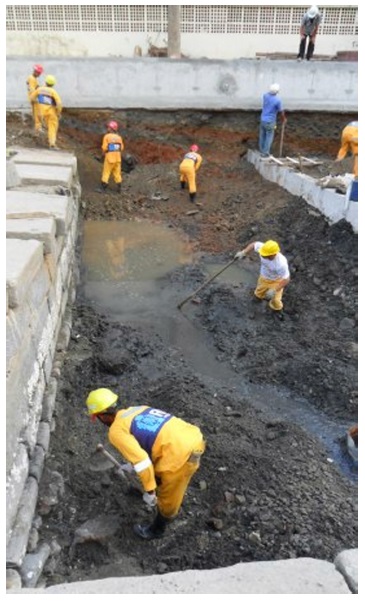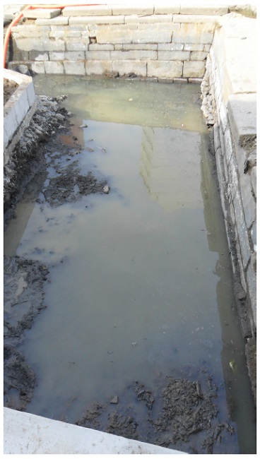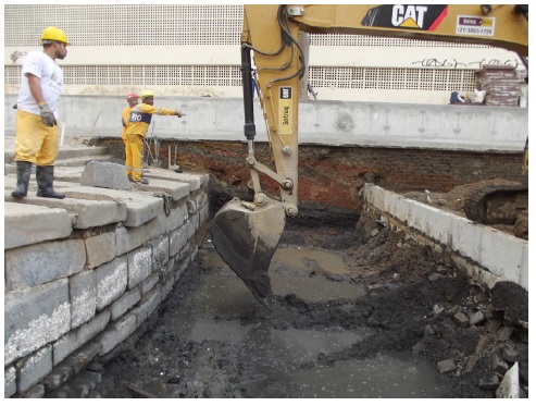 Foi dada, então, continuidade à escavação dessa abertura inicial, aprofundando-a. A partir de 1,85 m, foram encontrados os primeiros vestígios do que se supôs ser o Cais da Imperatriz, no caso, lajotas de pedra de diferentes dimensões, arrematadas por blocos também de diferentes dimensões posicionados verticalmente, formando uma borda. Saindo dessa estrutura foi observado um segmento de tubo de ferro, com cerca de 0,40 m de diâmetro, parcialmente submerso. A partir de 1,0 m de profundidade, a água do lençol freático, somada à subida do nível do mar na maré alta, alagava a área de escavação, dificultando o trabalho e a observação de vestígios arqueológicos. Foi iniciado o bombeamento de água para facilitar o andamento dos trabalhos (Figuras 13).