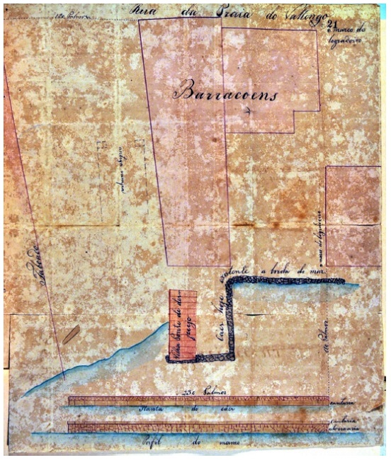 Nela figuram, à rua da Praia do Valongo, as seguintes construções: "cais hoje existente à borda do mar", "velha ponte de despejo", "taboado", "barracões", além de dois registros do "marco do logradouro". Não é possível saber se os "barracões" representados a essa altura eram remanescentes da época do tráfico para acolher e redistribuir os que chegavam, ou se eram posteriores, destinando-se a outras finalidades. A localização do "taboado" permite supor a existência de uma cobertura sobre a vala de escoamento que existia ali, na antiga área da drenagem natural, que viria a ser descrita dez anos depois, em 1841, como "imunda"21. A "velha ponte de despejo" sugere se tratar de local para descarte de materiais imprestáveis. Ao ser descrita como velha, é a única que permite aventar que existisse há muito tempo. No mais, não é possível atribuir as estruturas representadas e descritas na planta ao cais que funcionou até seis anos antes.
