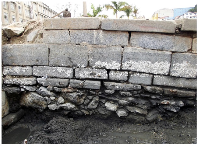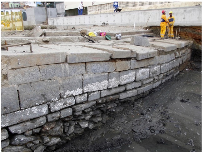 Na lateral da rampa, as escavações deixaram à mostra seu sistema construtivo, tendo sido possível observar uma construção ciclópica com alvenaria de pedras arrumadas, de dimensões variadas, porém em sua maioria grandes, empilhadas sucessivamente em oito camadas (Figura 84). Hoje em dia, aparentemente, assentadas a seco, apresentando em sua junção apenas remanescentes do sedimento terroso escavado, elas devem ter sido certamente unidas por argamassa de cal e areia, porém sobre esse elemento nada se sabe. Não há sinais visíveis da sua presença para a fixação desses blocos, embora ela deva ter sido utilizada para essa finalidade, inclusive porque figura no registro documental a necessidade do seu emprego, de modo a fortalecer a estrutura. Contudo, diante das vigorosas investidas do mar, somadas ao grande volume de águas pluviais drenadas da superfície terrestre, seus vestígios teriam sido lavados, não restando evidências visíveis das argamassas utilizadas originalmente nessa construção. De todo modo, a julgar pelo mau desempenho que apresentou ao longo do século XIX, constantemente danificada pela força do mar, a argamassa ali utilizada parece ter atuado mais como berço para assentamento dos blocos que propriamente como um elemento destinado a aumentar de fato sua resistência e melhorar sua performance.