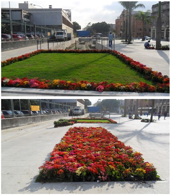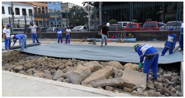 De modo a guardar em segurança as pedras retiradas do calçamento do Cais do Valongo e do Cais da Imperatriz para a construção das calçadas laterais, foi feito um depósito provisório para o seu armazenamento controlado, até que venha a ser feito o trabalho de reconstituição dos elementos faltantes e de consolidação dos calçamentos. As pedras foram recobertas com o geotêxtil bidim e areia lavada (Figura 111), e sobre esse depósito foi feito um gramado ornado com flores à toda volta, integrado à paisagem mais ampla da praça (figs. 112 e 113).