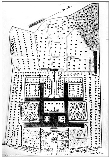 O hospital mantinha entre seus procedimentos a conscientização das famílias acerca da doença, o que era feito em domicílio pelos médicos assistentes. Contudo, isso não se refletia na frequência das famílias em visitas aos doentes, sendo muitos abandonados na instituição. Por outro lado, o impacto da construção do edifício hospitalar fez-se sentir pelo afluxo de visitantes ao nosocômio, que se tornou um passeio de fim de semana dos portuenses, decorrência também do tratamento do paisagismo fronteiro do lote e a utilização do amplo terreno posterior como horta - designada em 2015 como a maior horta social da Europa86. Essa preocupação com os espaços verdes fez parte da concepção original do hospital, como se percebe na planta publicada no livro Os alienados em Portugal II Hospital Conde de Ferreira, escrito pelo médico António Maria de Senna (Figura 8).