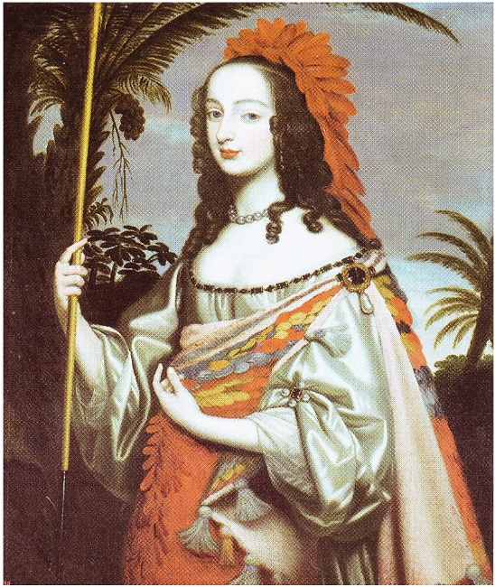 Essa jovem é a princesa Sofia do Palatinado, retratada por sua irmã, Louise Hollandine do Palatinado, ambas filhas de Frederico V, eleitor palatino, e Elizabeth Stuart. Os retratos de damas da corte fantasiadas não eram certamente incomuns. Mas em geral elas "usavam turbantes ou máscaras, fantasiavam-se de personagens alegóricos ou mitológicos, ou ainda representavam um papel em peças teatrais dançantes ou balés da corte"7; elas não se valiam de adereços e objetos indígenas sul-americanos, então raríssimos na Europa. Não há nenhuma certeza sobre o contexto específico de produção desse quadro, que pode ter sido pintado em 1652, por ocasião do casamento de Guilherme Frederico e Albertina Agnes, ou até mesmo antes, em 1646, segundo uma especulação que o vincula ao matrimônio do eleitor de Brandemburgo com Louise Henriette van Orange-Nassau. A ocasião pode ainda ter sido inteiramente corriqueira: Nassau teria simplesmente emprestado o manto para que Louise retratasse a irmã. Em todo caso, ela não poderia ter pintado esse objeto em detalhes sem tê-lo visto pessoalmente, o que pressupõe a circulação do manto na corte de Haia nos dez anos subsequentes ao retorno de Nassau do Brasil. O significado dessa circulação não é contudo plenamente inteligível em si mesma: ela faz parte de um fenômeno muito mais amplo no tempo e no espaço.