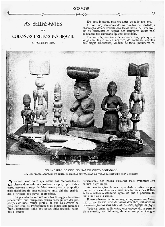 RODRIGUES, Raimundo Nina. As bellas-artes nos colonos pretos do Brasil: a esculptura. In: ARAUJO, Emanoel. Para nunca esquecer: negras memórias/memórias de negros. Rio de Janeiro: Museu Histórico Nacional, 2002, p. 158-163. [reprodução do original de mesmo título, Revista Kosmo, Rio de Janeiro, ano I, n. 8, 1904].