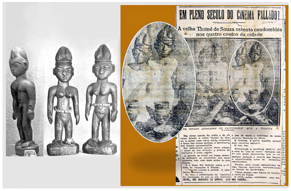 A imagem do recorte de jornal também advém dos levantamentos junto aos arquivos do IGHBA e à Biblioteca Pública do Estado da Bahia realizados por Ademir Ribeiro Junior, tendo-se mantida inédita até que, com estímulo do próprio Ademir, viesse a ser publicada neste artigo - favoreceu-nos exercitar aqui a aplicação de um procedimento indispensável no estudo de objetos, indicado no início por Angela Lühning, entre outros autores. Vê-se que as cinco estatuetas mantêm grandes afinidades, mas as existentes entre os componentes dos pares de ibeji são exclusivas. Observa-se que foram confiscados em operações com apenas quatro anos de diferença (os Arthur Ramos em 1927, como já mencionado, e estes, do jornal, em 1931), e perfazem indiscutivelmente obra de um mesmo “ateliê”, mas seria pouco provável terem sido esculpidas por um mesmo artista.