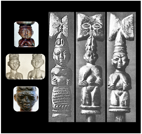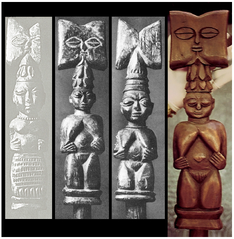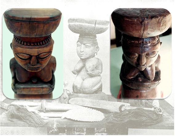 São de figuras ajoelhadas. Duas apresentam as mãos segurando, de um lado e de outro, a sua barriga inflada e seios de formato semelhante, enquanto se veem, no oxê do MAB, mãos em concha, com as palmas voltadas para cima, como a iemanjá do trono de Nina Rodrigues à base dos seios. Nesse aspecto, também lembra a “Yemanjá” considerada por Marianno, vista na Figura 3 comparada ao trono de Nina: nessas duas peças, como no oxê do MAB, os seios da figura humana esculpida recaem sob forma de dois afilados, mas como que inflados, cones arredondados divergentes, já a partir da base do pescoço.