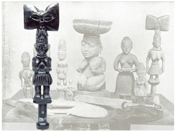 Há um outro agrupamento de esculturas antropomórficas de madeira, também relacionadas aos cultos afro-brasileiros, que analisamos a partir de uma fotografia publicada pelo etnólogo alemão Leo Frobenius em 1898, poucos anos antes de Nina Rodrigues publicar a sua.102 Entre elas, há outros ibejis, oxês e outras figuras relacionadas a Xangô. Estas, como as esculturas do corpus que apresentamos aqui, preconizam uma revisão dos rumos dos estudos de cultura material e da arte africana no Brasil.