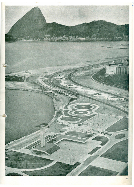 O Parque do Flamengo na cidade do Rio de Janeiro foi projetado em padrões similares, com seus 1.251.244,20 m² de área total - dos quais menos de um terço é relativo às pistas de alta velocidade, rótulas e retornos. O Aterro de Carlos Lacerda, na leitura de Lauro Cavalcanti,7 converteu-se no “espelho carioca do plano para a nova capital”, e o modernismo arquitetônico da Novacap (Brasília) teria um representante à altura na Belacap (Rio).8