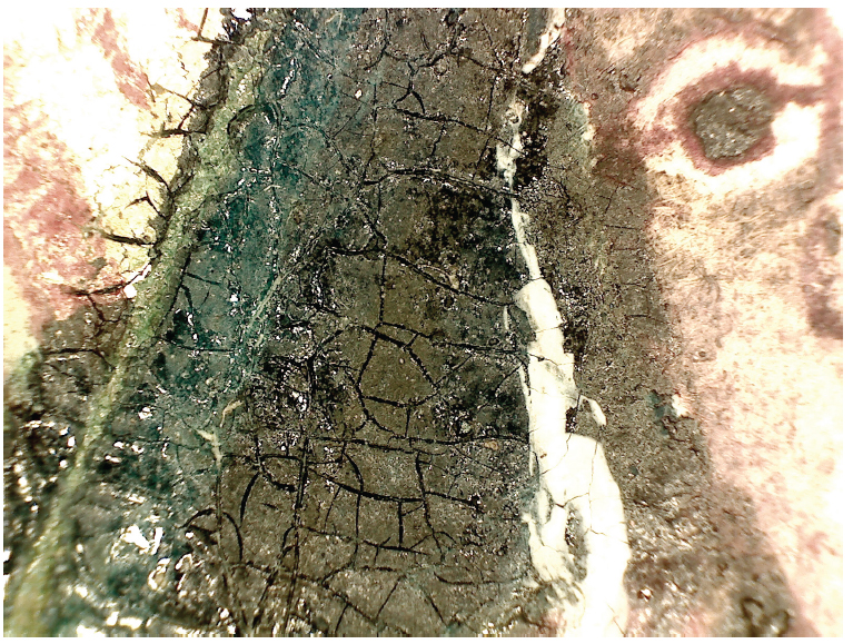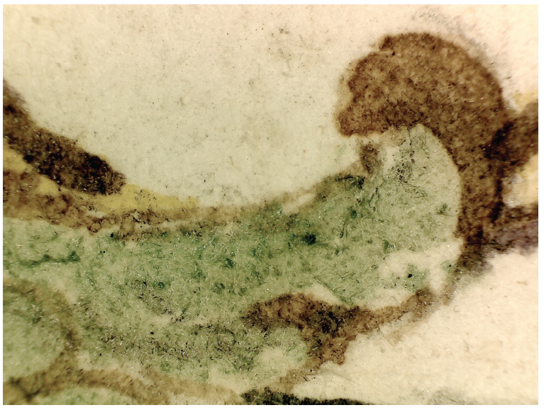 No entanto, ainda que os mesmos ingredientes sejam usados, diferenças na preparação das tintas gerarão resultados significantemente distintos. Quando o pigmento recebe uma moagem muito fina, mistura-se mais facilmente a uma quantidade menor de aglutinante diluído em água, resultando em uma tinta com mais transparência, na qual o brilho do pigmento é mais perceptível após a evaporação do veículo (água). Essas são tintas cujas cores se integram com facilidade, mesmo quando as camadas subjacentes já estão completamente secas. Já em uma moagem mais grossa, é necessária maior quantidade de pigmentos e de aglutinante para se chegar a um bom poder de cobertura. Este processo resulta em uma tinta mais densa e consistente, menos fluida e mais difícil de misturar com outras tintas, porém mais fácil de combinar com outras cores depois de secas, sendo excelente para técnicas de aplicação que usam pinceladas curtas e descontínuas, impedindo que uma cor se mescle com outras camadas já aplicadas (Figura 3). Devido a sua densidade, é a tinta que tem mais propensão a criar craquelês no processo de degradação e envelhecimento (Figura 4). Se os mestres antigos não faziam distinção nominal entre esses dois diferentes produtos, mais ou menos densos, hoje os designamos por “aquarela” e “têmpera guache” ou apenas “guache”.