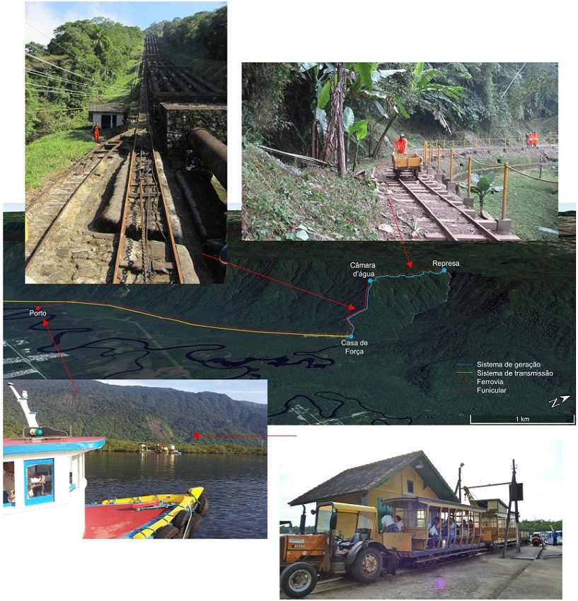 Por se situar na escarpa da Serra do Mar, em uma área de difícil acesso, a construção de Itatinga demandou a criação de uma extensa rede de infraestrutura. Inicialmente foram erigidos diversos edifícios provisórios para alojar os trabalhadores e abrigar o maquinário utilizado na obra. Tais estruturas foram paulatinamente substituídas por habitações e oficinas permanentes, muitas delas existentes até os dias atuais. A obra também demandou um sistema de transporte próprio, já que o sítio onde a usina viria a ser implantada não possuía - e ainda hoje não possui - ligação com o sistema viário da região. Foi construído então um pequeno porto no rio Itapanhaú. Inicialmente as embarcações transportando trabalhadores e cargas vinham do Porto de Santos pelo canal de Bertioga, seguiam pelo rio Itapanhaú e atracavam nesse pequeno porto. Posteriormente, com a construção da rodovia Doutor Manoel Hyppolito do Rego (BR-101), o transporte de pessoal e material passou a ser realizado por via terrestre até a margem direita do Itapanhaú, sendo a travessia do rio realizada por uma pequena embarcação. Partindo do “portinho”, como é popularmente conhecido, construiu-se um ramal férreo de aproximadamente 7 quilômetros de extensão, cujo ponto final é o local onde a casa de força viria a ser construída. Dali parte um sistema funicular que se estende pela encosta da escarpa até atingir a câmara d’água. Ao final desse sistema, um segundo ramal férreo segue até a represa, situada no rio Itatinga. Apesar de terem sofrido algumas mudanças em seus traçados após a conclusão das obras, esses sistemas permanecem em funcionamento até hoje (Figura 2).