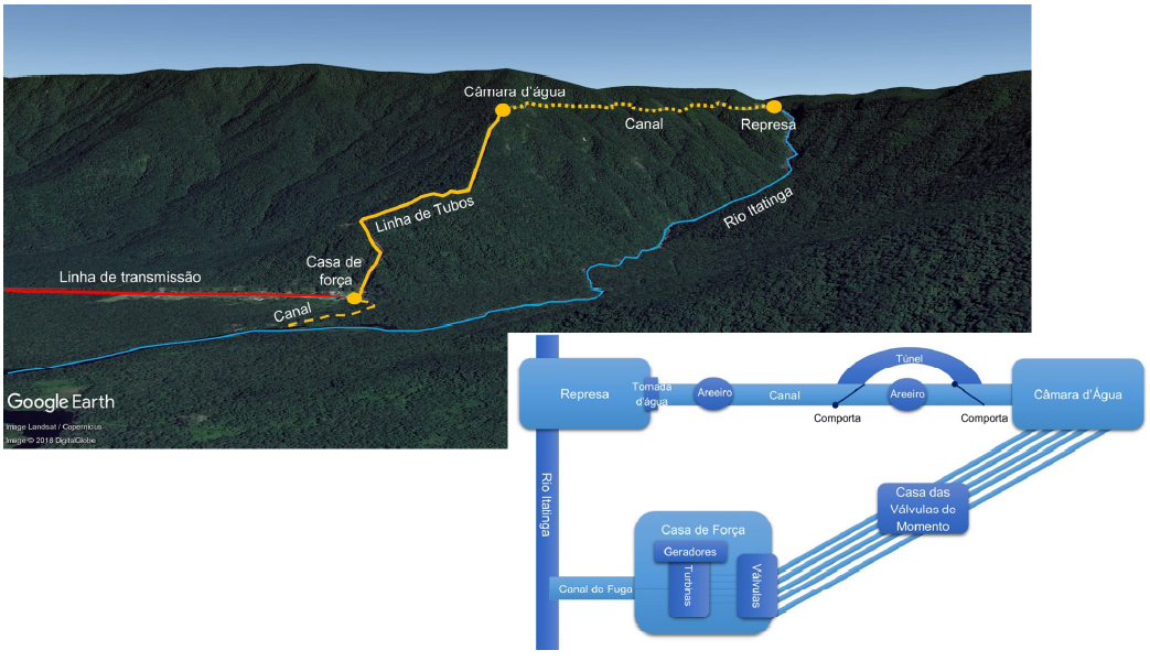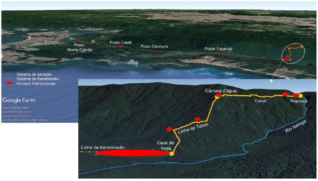 A Usina de Itatinga é uma PCH a fio d’água, com capacidade de 15 megawatts. Atualmente o conjunto é operado pela Companhia Docas do Estado de São Paulo (Codesp).11 Seu sistema de geração de energia constitui um desvio do rio Itatinga. Em uma garganta desse rio há uma pequena represa de onde parte um canal que acompanha a encosta da escarpa da Serra do Mar, estendendo-se por aproximadamente 2,5 quilômetros. O canal termina na câmara d’água, de onde partem cinco tubos de queda que seguem ao longo do divisor de águas, conduzindo o fluxo à casa de força. Cada tubo possui cerca de 1,7 quilômetro de comprimento e vence um desnível de mais de 600 metros. Com a finalidade de proteger essa grande tubulação de golpes de aríete, a linha de tubos conta com dois conjuntos de válvulas de momento, um deles abrigado na casa de válvulas. Chegando à casa de força, a água atinge cinco turbinas do tipo Pelton, produzidas pela alemã J. M. Voith, e tem sua energia potencial transformada em energia cinética, que, por sua vez, é convertida em energia elétrica por geradores GE, localizados ao lado de cada turbina. Ao sair da casa de força, a água segue por um canal aberto até retomar o leito do rio Itatinga, aproximadamente cinco quilômetros a jusante da tomada d’água (Figura 3).