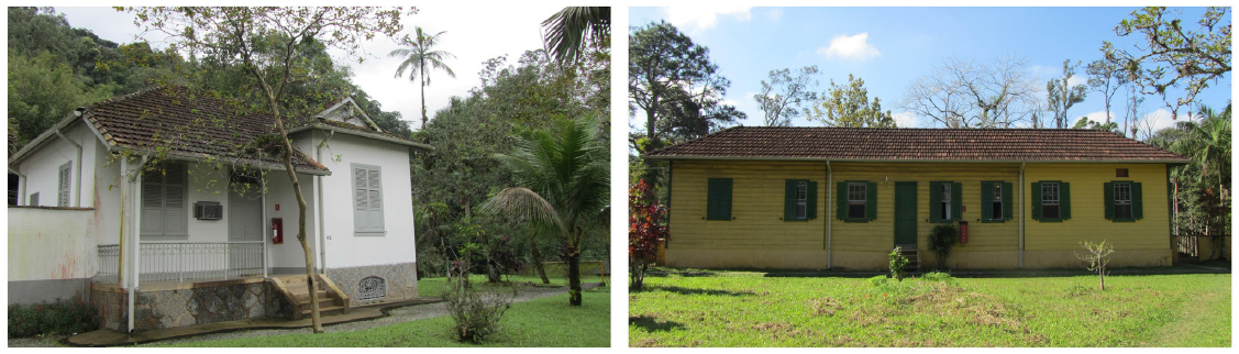 A maior parte das edificações residenciais do conjunto é composta por “chalés de madeira”, denominação adotada pelos habitantes do local. Esses edifícios se dividem em dois setores, um em madeira e outro em alvenaria. O primeiro é composto por uma estrutura rudimentar do tipo gaiola, apoiada em pilaretes de alvenaria de tijolos, elevando o edifício do solo. O sistema de vedação utilizado é conhecido regionalmente como tapamento americano, constituído por tábuas de madeira pregadas horizontalmente no exterior dos esteios, com encaixe tipo macho e fêmea. As divisórias internas são constituídas por esteios e vigas de madeira, nas quais são pregadas tábuas no sentido vertical. As construções do segundo setor são de alvenaria de tijolos e não elevadas do solo, cobertas por telhados com estrutura de madeira vedada por telhas francesas (Figura 7).