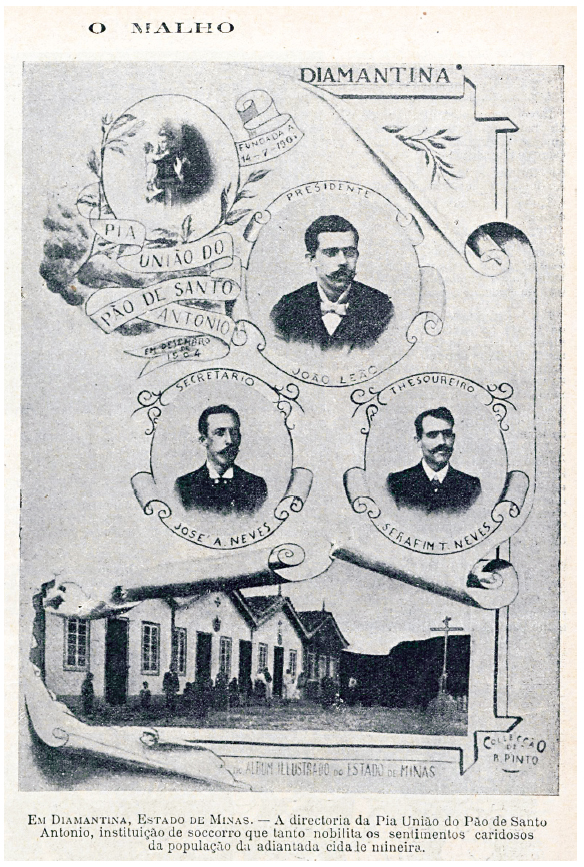 Se por um lado não existem evidências concretas da publicação do álbum proposto por Raymundo Pinto, por outro foi possível verificar indícios da produção de imagens fotográficas para esse fim. Nesta pesquisa, por exemplo, foi possível identificar imagens feitas para inclusão nos álbuns de Minas e de Diamantina, e que foram posteriormente publicadas na revista O Malho, em 1907. Uma dessas imagens é uma montagem fotográfica dos integrantes da “Diretoria da Pia União do Pão de Santo Antônio”,64 com um trecho dos prédios da respectiva instituição (Figura 1). As montagens visavam a criar registros sobre as corporações, transmitindo algumas informações sobre elas, com destaque para seus dirigentes. No caso da imagem da Pia União, os textos nos informam sobre a fundação da instituição, a data de realização da montagem, nomeia os dirigentes, identifica a cidade (Diamantina) e destaca, na base do conjunto, que ela fazia parte do Álbum Ilustrado do Estado de Minas. As informações textuais que contextualizam a imagem apontam, portanto, para uma possível inserção no álbum, conforme a Figura 1.