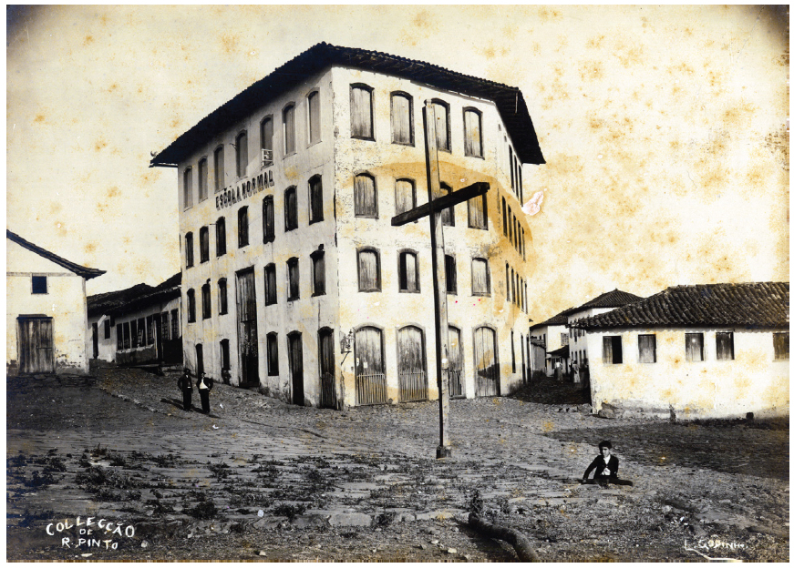 A fotografia da Escola Normal de Minas Novas (Figura 2) é um dos tipos de imagem que interessava ao projeto de Raymundo Pinto. Mostrar as escolas em funcionamento nas cidades de Minas era uma maneira de caracterizar a preocupação da sociedade com a educação, vista como uma das formas de garantir a continuidade do processo de civilização dos costumes na região. A escola se destaca em relação ao casario do entorno devido à sua altura, ainda mais evidente quando contrastada com as poucas pessoas flagradas na cena. Na composição da imagem, o fotógrafo posicionou-se em frente ao prédio, colocando-o no centro, de modo a conferir-lhe destaque. A escolha de inserir o cruzeiro no enquadramento da cena é significativa da junção entre educação e religião. A fotografia é de autoria de Lafaiete Godinho, auxiliar de Raymundo Pinto, responsável pelas fotografias de várias cidades do Norte do estado.