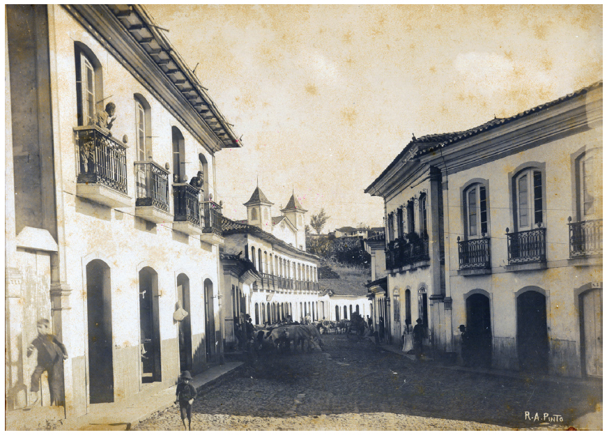 Outra fotografia que provavelmente foi feita no contexto de produção do Álbum de Minas é a vista parcial da rua da Cavalhada, na cidade do Serro (Figura 3). Segundo notícias da imprensa, Raymundo Pinto esteve na cidade realizando fotografias para seu projeto, em março de 1905.67 A feição colonial da cidade é o que mais se destaca, transformando a fotografia em uma prova da antiguidade e da tradição da região. O casario de dois andares, a presença das torres da igreja ao fundo da imagem são demonstrativos do desenvolvimento urbano da cidade, que foi de suma importância para a economia aurífera e pastoril de Minas Gerais nos séculos XVIII e XIX. Em um Álbum de Minas, a cidade do Serro, como antiga sede da comarca do Serro Frio e, portanto, centro administrativo, jurídico e importante polo da economia da região mais ao norte do estado, representaria provavelmente um elo com o passado de vigor econômico e expressaria uma expectativa de reprodução desse padrão no século XX.