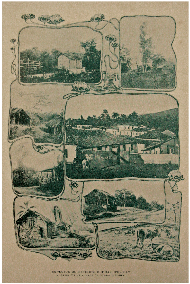 Os números subsequentes da Folha de Propaganda continuaram a tratar de assuntos relativos ao álbum. O nº 3 trouxe a reprodução de duas de suas páginas para demonstrar o tipo de trabalho que estava sendo feito, esclarecendo que a “estética” ficava a cargo do professor e artista Alberto Delpino (1864-1942). Uma das páginas estava dedicada aos “Aspectos do Extinto Curral d’El-Rey - Vue du Éteint Village de Curral d’El-Rey” (Figura 6), que será comentada no próximo tópico. Outra apresentava a cidade onde vivia Alberto Delpino, “Barbacena (Sítios e personagens) - Ville de Barbacena (Endroits et personages)” (Figura 4). Na montagem vemos o retrato do chefe do executivo municipal, a sala da Câmara Municipal, as escolas, uma cachoeira e um jardim. A página é um exemplo do modo como cada cidade seria representada no álbum, já que a ideia era compor uma imagem síntese. Tomando como referência a montagem de Barbacena, seriam destacados a liderança política municipal, a existência de um sistema de ensino em pleno funcionamento, alguma riqueza natural da localidade e algum espaço de convivência social, como o jardim, demonstrando os melhoramentos urbanos existentes. Neste exemplo particular, verifica-se a presença da versão em francês nas legendas, o que não foi mantido no álbum efetivamente publicado.
