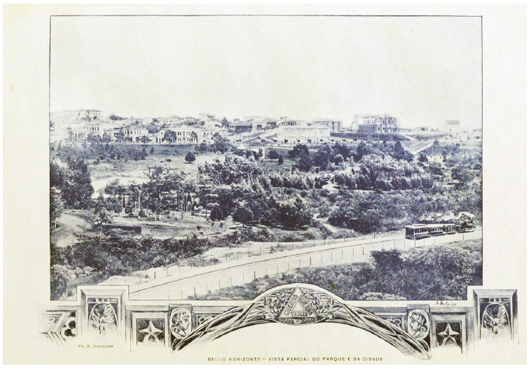 Duas páginas apresentam o mesmo título, “Belo Horizonte - vista parcial do parque e da cidade”. Ambas exibem um trecho da cidade, destacando-se, em primeiro plano, o Parque Municipal. Na primeira página (Figura 7), é acrescentado à imagem um desenho de uma locomotiva, elemento demonstrativo da interligação da cidade com a malha ferroviária do estado.