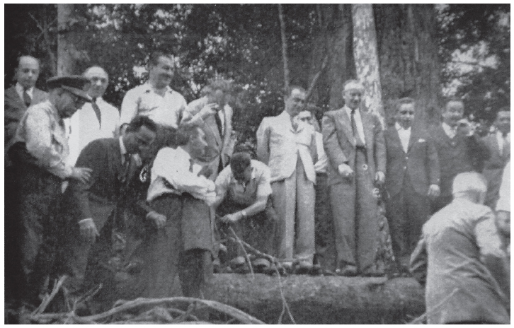 Para compreender a mensagem implícita nas fotografias é necessário cotejá-las com os discursos do período, buscando verificar com que substrato do real estamos nos defrontando. Uma possível interpretação se encontra na análise da fala de JK sobre a natureza, na qual ele reafirma as concepções presentes nas peças publicitárias da época da construção e inauguração da BR-14. Realmente alguns episódios dos dois anos do projeto ajudaram a dar os contornos épicos pretendidos pelo governo JK. No trecho final da estrada alguns acontecimentos teriam papel fundamental na memória construída sobre a rodovia: a morte de Rui de Almeida, engenheiro responsável pelo desmatamento da frente de Brasília, e principalmente a morte de Bernardo Sayão. O engenheiro, às vésperas do encontro em Ligação (nome criado para homenagear a conexão das duas vias), encontrava-se em uma espreguiçadeira após o almoço, quando o galho de uma árvore, isolada após o desmatamento, se partiu e o atingiu. Sua morte representou a criação do mito em torno do engenheiro, tido como bandeirante moderno pela propaganda presidencial.17 Alguns meses após a morte de Sayão, ocorreu o evento que ligaria os trechos da rodovia, em especial dois: o que viera de Belém e o que tinha origem em Brasília. O ato simbólico que daria concretude a essa definitiva conexão seria a derrubada de um jatobá pelo próprio presidente (Figura 2). A forma como o acontecimento é narrado por Juscelino expõe o papel daquela árvore em particular (e da mata em geral) no seu projeto de governo: