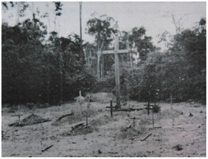 Retornando ao argumento de Borges, a fotografia pressupõe um jogo de inclusão e exclusão, ou seja, trata-se de escolhas que, como tal, não constituem apenas uma representação do real, mas integram um sistema simbólico pautado por códigos oriundos da cultura que as produz.30 Um aspecto de exclusão notado em todas as fotografias levantadas é a ausência de elementos indígenas. Uma explicação é possível: em grande parte dos textos aqui selecionados eram apontados chistes de membros da oposição ao governo, sugerindo que os jornalistas e políticos seriam atacados por índios e onças. Quando os indígenas surgem nos textos são somente oriundos de “tribos dóceis” ou “devidamente civilizados”, e parte do grupo de mateiros (trabalhadores responsáveis pela abertura das picadas) constituía-se de indígenas “civilizados”.31 No local onde Bernardo Sayão teve sua vida ceifada foi erguida uma cruz, simbolizando e reforçando o mito do “pioneiro” (Figura 4).