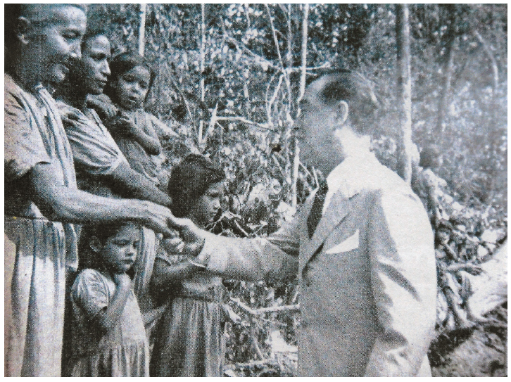 A Figura 2 não pode ser descolada do texto que a acompanhava. Além do caráter simbólico já referido, a fotografia foi também a celebração do encontro entre o presidente e os embaixadores da Inglaterra, da Alemanha, do Equador e da Tchecoslováquia. A viagem serviria para os representantes de nações amigas do Brasil conhecerem aspectos do país. Assim, JK mostraria a outros países o que seria o desenvolvimento nessas regiões. Na afirmativa de Vaitsman, “quatro embaixadores […] tiveram o privilégio de ver como o homem brasileiro e as máquinas estão afrontando a misteriosa floresta amazônica”.29 Além de possibilitar à comitiva estrangeira conhecer aspectos da cultura local e sua culinária (foi oferecido um banquete em plena picada), esse ato demonstrou a forma como a imagem do país deveria ser levada ao exterior: um lugar que preservava sua cultura tradicional, mas que também possuía características modernas, como demonstrava a construção de estrada.