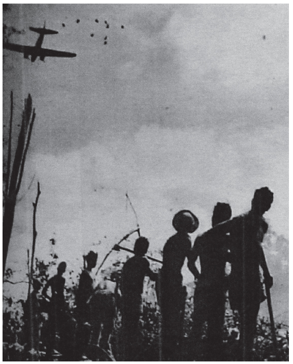 Constituem-se assim duas visões sobre a natureza: ela seria simultaneamente objeto de domínio e de reverência; deveria ser “torturada” e “dobrada a serviço do homem”. Não é difícil identificar que uma percepção de vitória rege os objetivos de expor e divulgar as Figuras 6, 8 e 9: máquinas abrindo picadas na mata e a abertura de um campo de pouso em meio à floresta amazônica dão o tom épico dessa “luta” narrada pelos meios de comunicação do período. Afinal, se os discursos oficiais do próprio presidente davam conta da intransponibilidade da natureza, nada mais comemorativo que mostrar a primeira clareira aberta na Belém-Brasília. Alguns aspectos da construção da estrada eram realmente impressionantes: várias reportagens descrevem o lançamento de mantimentos e até animais vivos dos helicópteros e aviões para os trabalhadores, como mostra a Figura 7. As imagens desempenharam, pois, importante papel na “construção cultural” da sociedade, sendo testemunhas dos arranjos sociais e sobretudo das maneiras de ver e pensar o passado.33